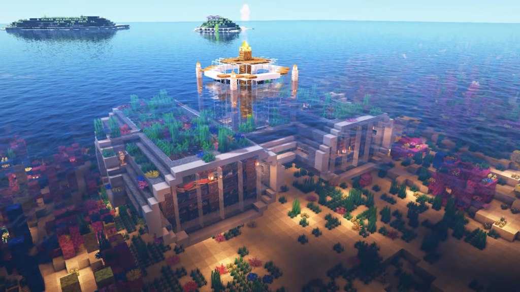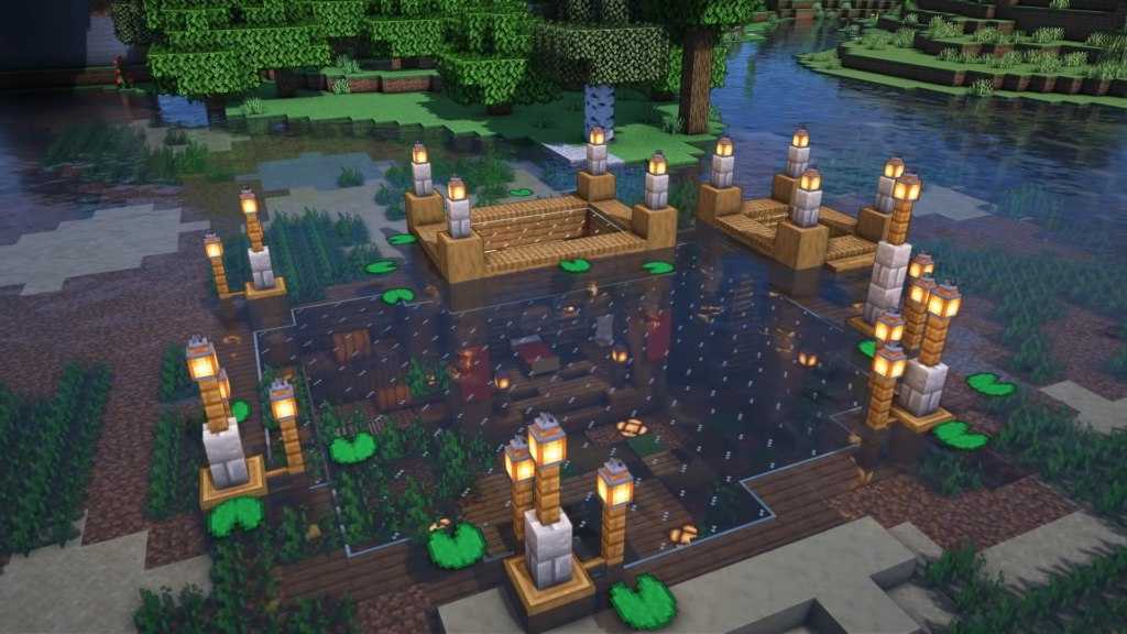 Как мы уже упоминали ранее, нет необходимости углубляться в океан, чтобы построить отличную подводную базу в Minecraft. Это даже жизнеспособный вариант для более мелководья всего с парой блоков воды, как эта базовая идея, созданная Архелаем. Они решили использовать дизайн затопленного кратера, где вы получите безумный вид с неба, когда солнце садится и начинает сиять в небе. Нам не может не нравиться любая базовая идея, которая позволяет эффективно использовать новые источники света, а фонари — одно из самых популярных дополнений к любой конструкции — фонарные столбы, погруженные в воду, выглядят потрясающе! Если вы решите установить свою базу в районе Болота, вам следует придерживаться этой базовой идеи.