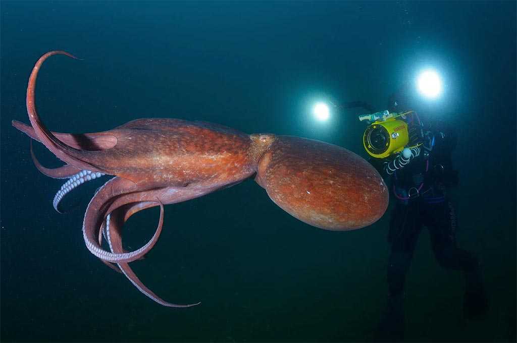 Тут же, на глубине 100 метров живет уникальный обитатель океанских вод — Гигантский Осьминог — самый крупный вид осьминогов на земле. Своей способностью менять окрас, маскируясь под камни и кораллы, существо напоминает хамелеона. Благодаря своим размерам (по некоторым данным длина некоторых особей может достигать 9 м), именно этот вид осьминогов стал поводом для страшных рассказов о морских чудовищах, хватающих моряков с палуб кораблей.