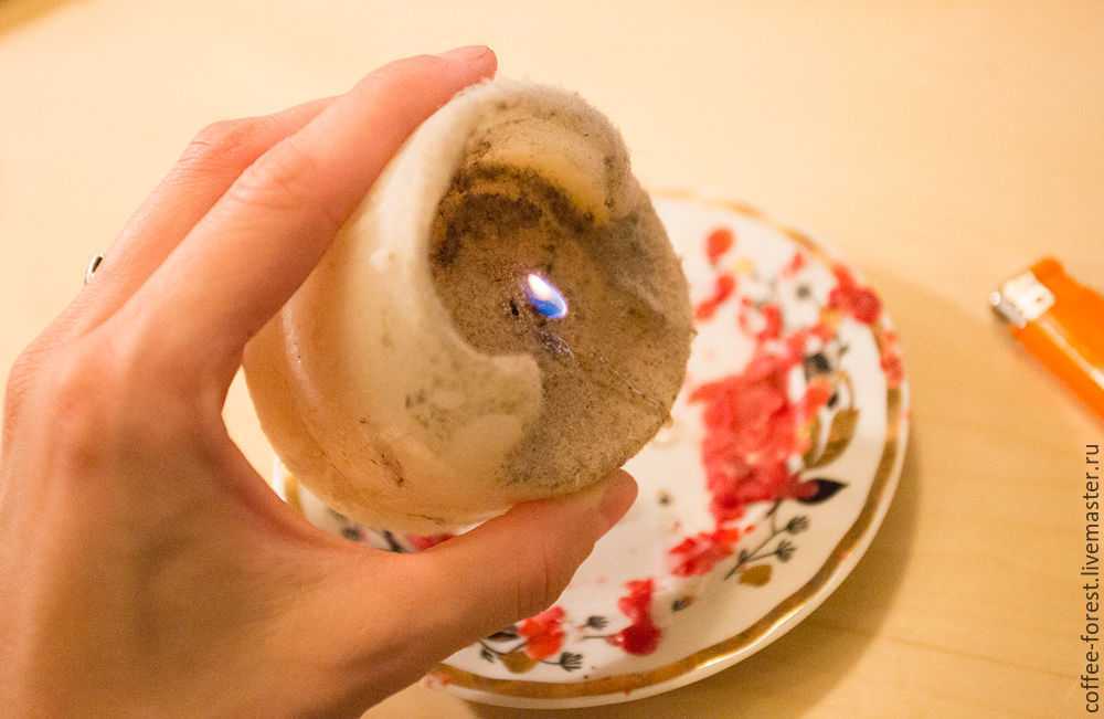 Поджигаем фитиль, чтобы проверить работу свечи. Затем ставим ее на блюдце или одноразовую тарелку.
