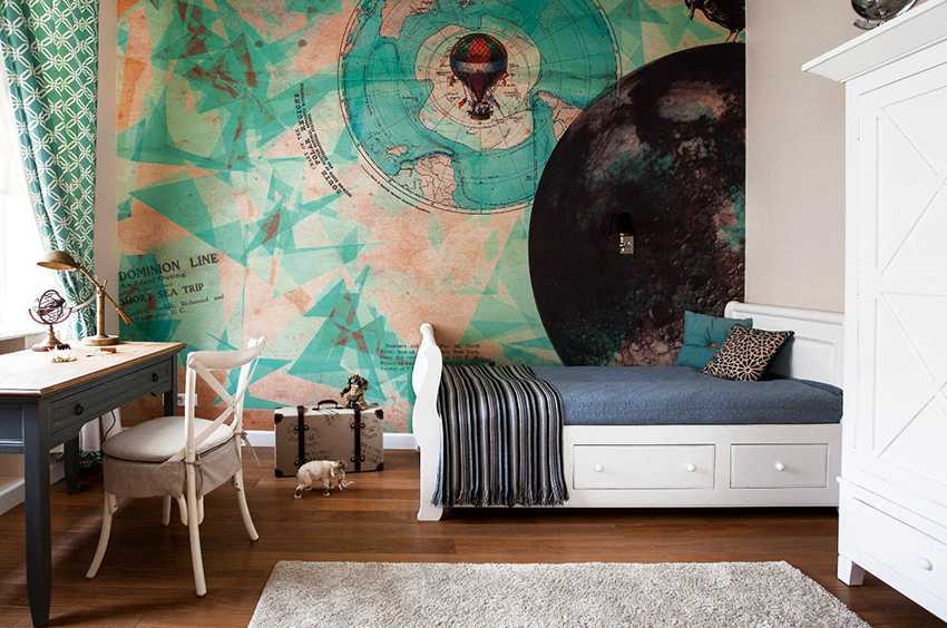 - Карта мира. Географическая карта — это идеальные обои для комнаты школьника. Благодаря им детская приобретет не только интересный принт, но и у ребенка появится отличная возможность благодаря зрительному восприятию выучить страны, города, водную акваторию и леса.