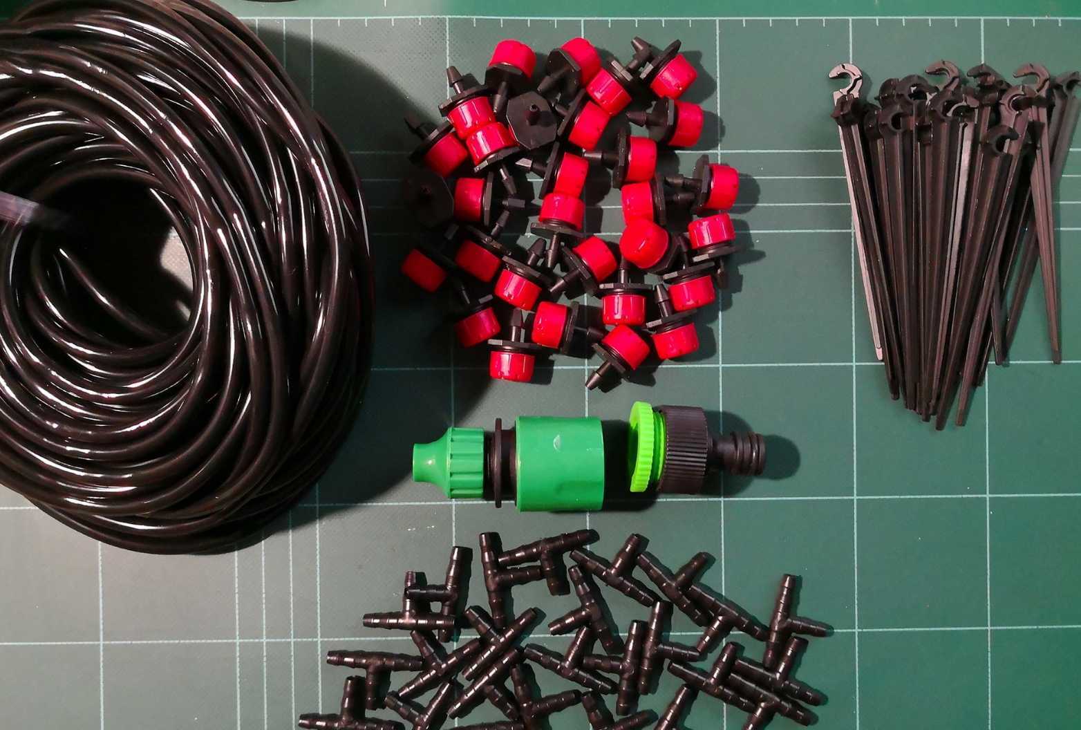 Два переходника помогут подключиться к водопроводной системе. Наличие насадок для дождевания обеспечит возможность выбирать режим полива — капельный под корень или разбрызгивание. Такую систему легко смонтировать самостоятельно и забыть о необходимости полива. Больше никаких шлангов, ломающих растения, пачкающих все вокруг. Достаточно весной собрать систему, а осенью демонтировать, убрать на хранение.