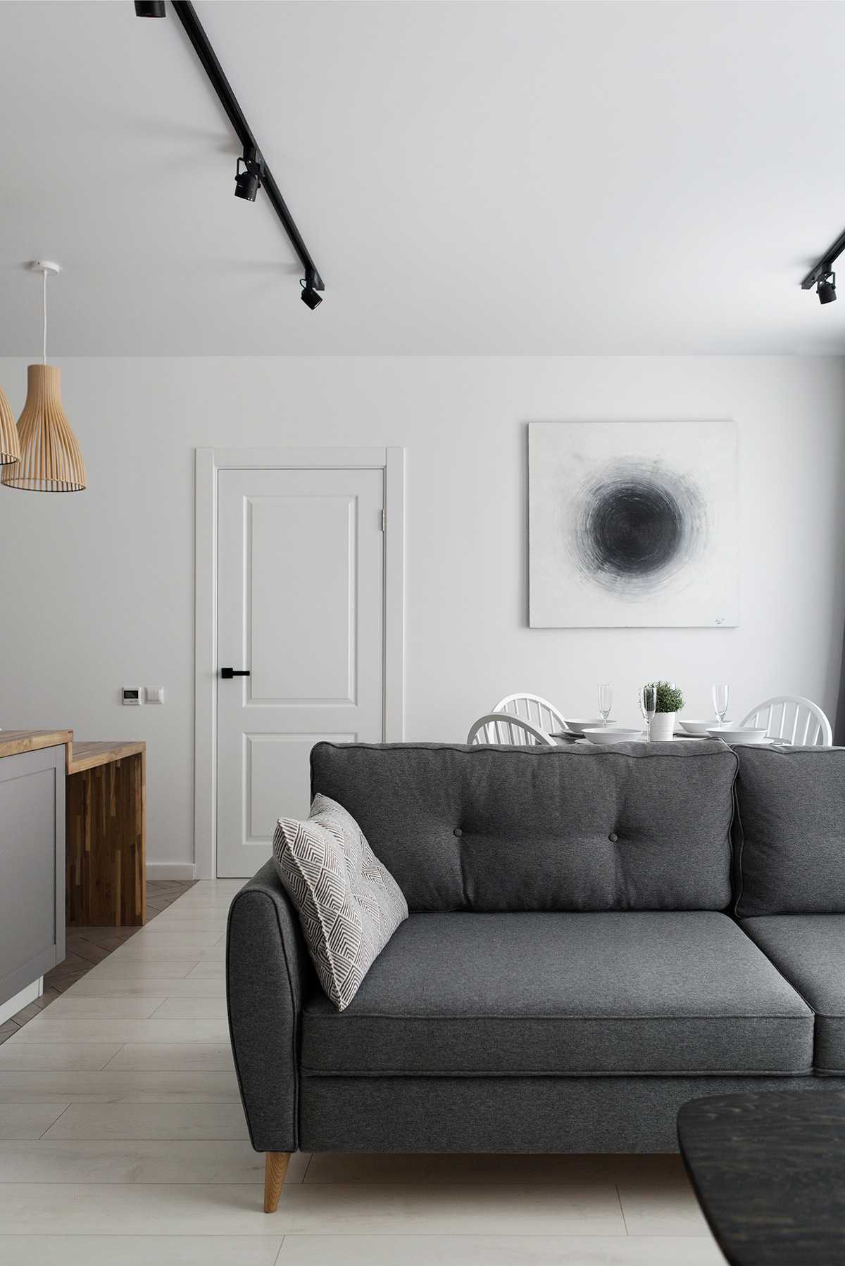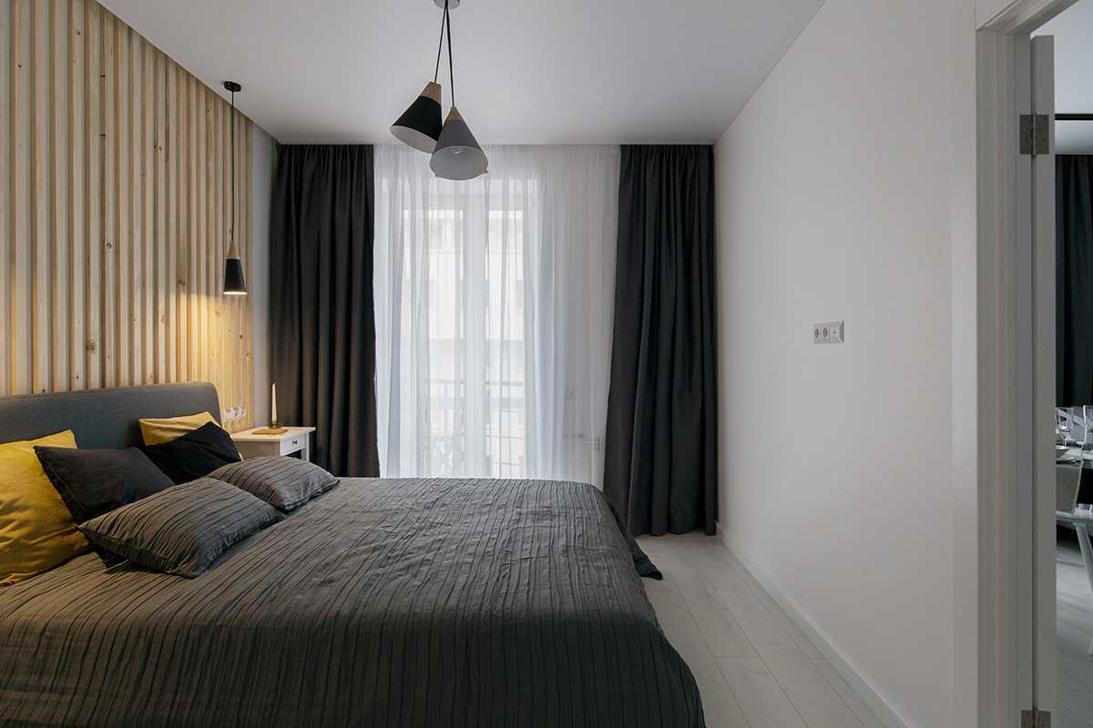 Там, где раньше располагалась кухня, спланировали спальню, а само место для готовки обустроили в гостиной, присоединив часть прихожей. Несущая конструкция между комнатами осталась нетронутой. Чтобы узкое пространство казалось шире, дизайнер воспользовалась сразу несколько приёмами: