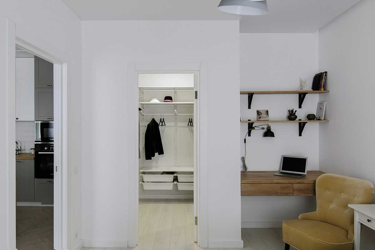 По проекту в квартире была не гардеробная, а небольшая кладовка. Я подумала, что будет удобнее ее продлить и сравнять с выходом. И мы не прогадали. Такой вариант нравится гораздо больше, чем шкафы во всех комнатах.