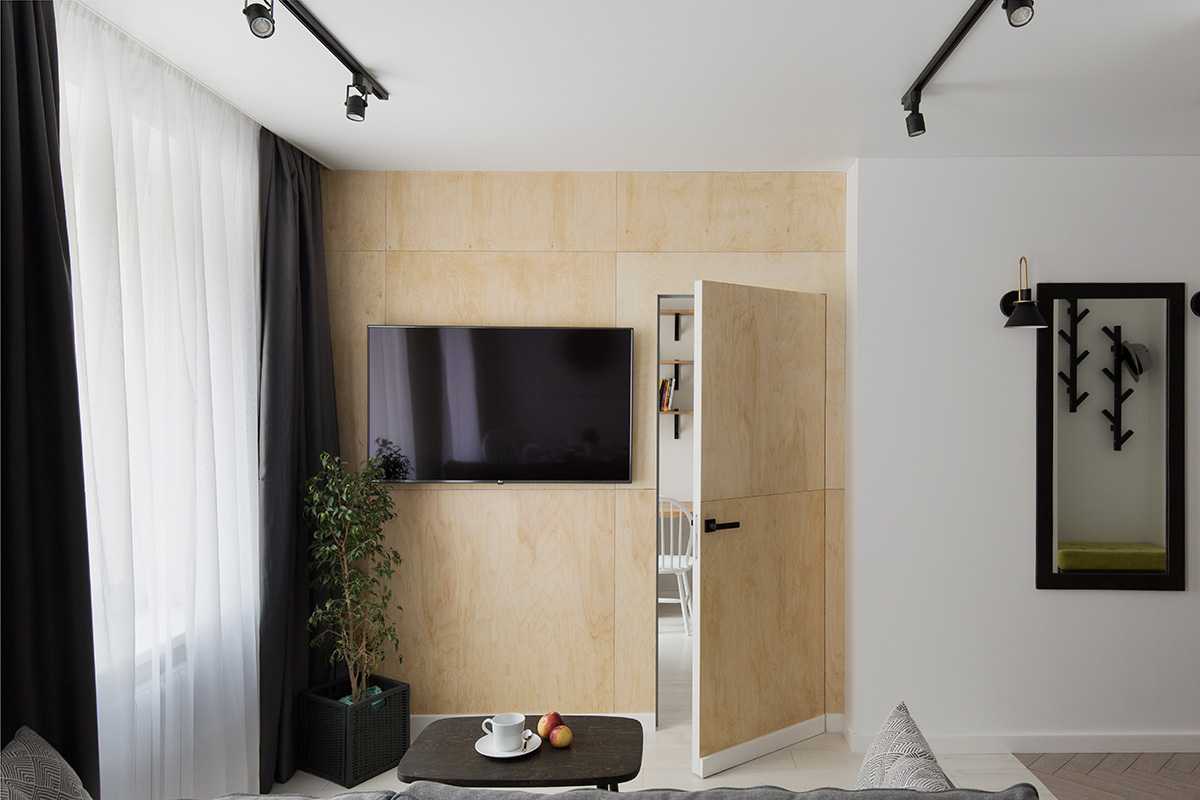 Одна из стен в гостиной обита фанерой. По словам Анны, на небольшой простенок нужно было повесить телевизор. Решение было найдено: отдельная дверь сильно бросалась бы в глаза и скрадывала пространство, а дверь-невидимка позволяет воспринимать всю конструкцию как единое целое – и не мешает.