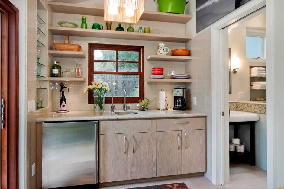 Если можно установить мойку под окном, которое соединяет кухню с гостиной, пространство для экспериментов еще больше расширяется. Убрав стекло, можно соединить 2 комнаты. В таком случае подоконник будет выполнять функции барной стойки или стола. Это поможет существенно упростить уборку.