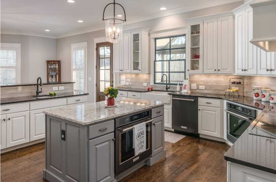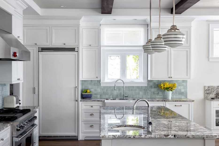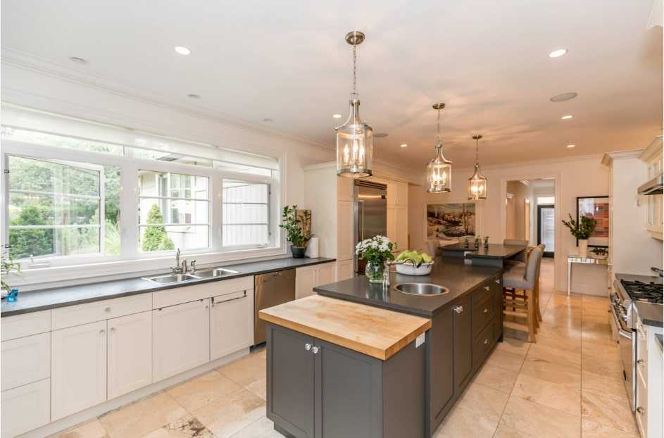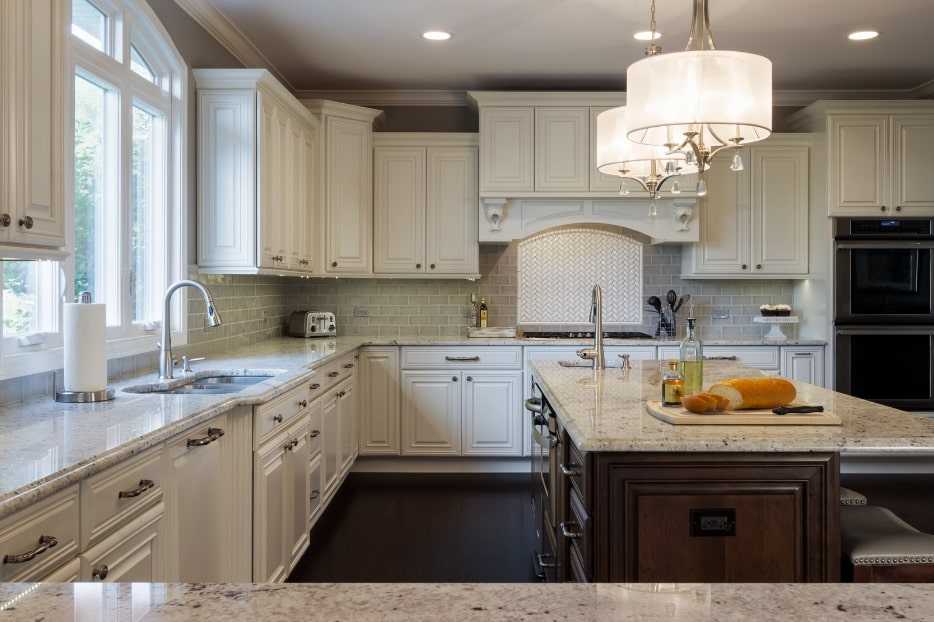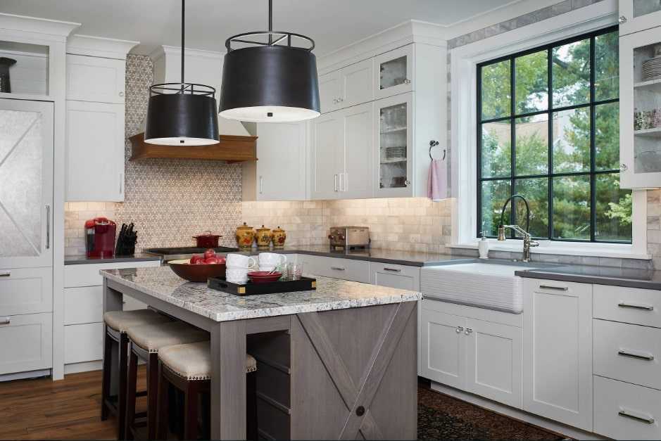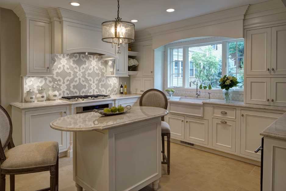 За основу проекта кухни с двустворчатым большим окном взяты классические элементы интерьера, которые дополнили деталями из французского стиля Прованс. Радикальных цветовых решений в пространстве нет – весь кухонных гарнитур, пол и стены выполнены в спокойных оттенках слоновьей кости и молока. В качестве контрастных пятен выступают черная ажурная люстра и два черных крана для воды – один на острове, другой на мойке под окном.
