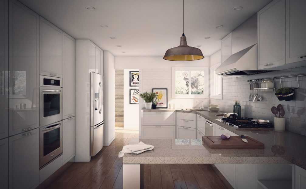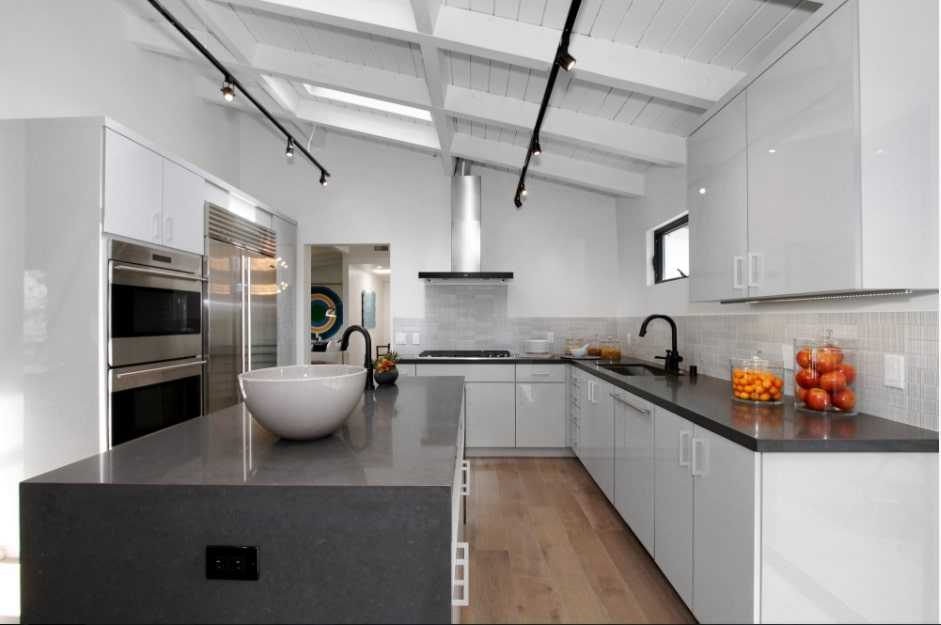 Такое расположение предметов интерьера хорошо подойдет для кухни в стиле модерн
