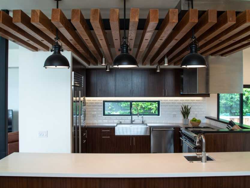 - Чтобы света на кухне было достаточно, в потолок монтируют встроенные светильники.