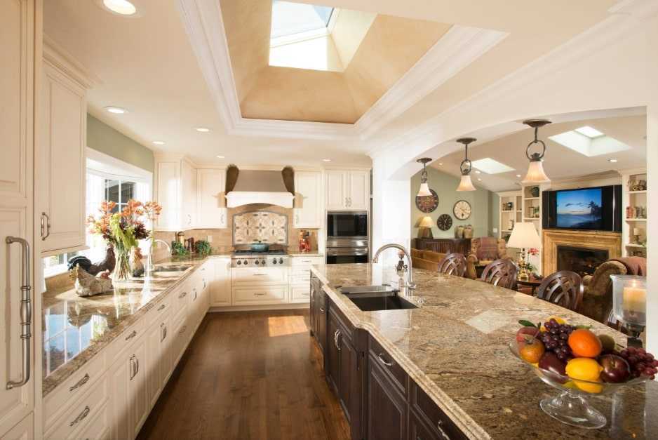 - Использовать рабочее пространство перед окном и установить там мойку. В этом случае у хозяйки всегда будет всё под рукой – с одной стороны остров с разделочным столом, с другой – плита (в данном интерьере декорированная под камин с лепниной).