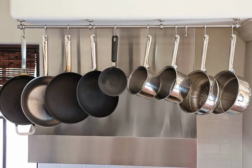 Самый простой рейлинг представляет собой нержавеющую трубу, которая крепится к стене. Причем ее размеры могут значительно различаться. От небольшого подвеса для нескольких половников до конструкции на всю стену кухни. И на последней смогут расположиться, практически, любой предмет, используемый на кухне.