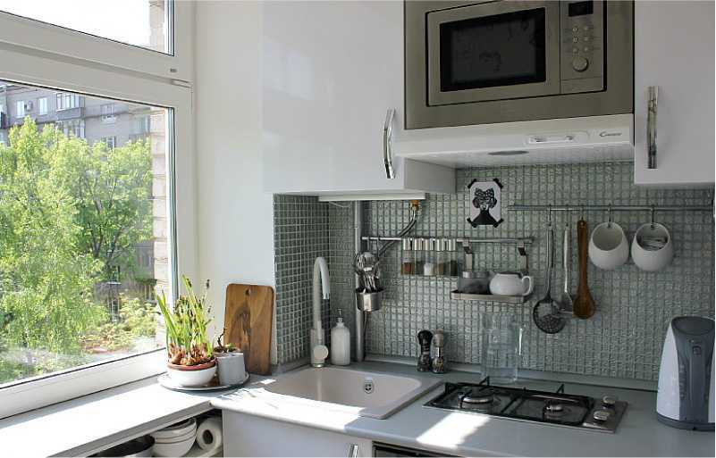 Можно купить полочки и крючки. Здесь будут храниться кухонные принадлежности, чашки и другие необходимые на кухне инструменты.