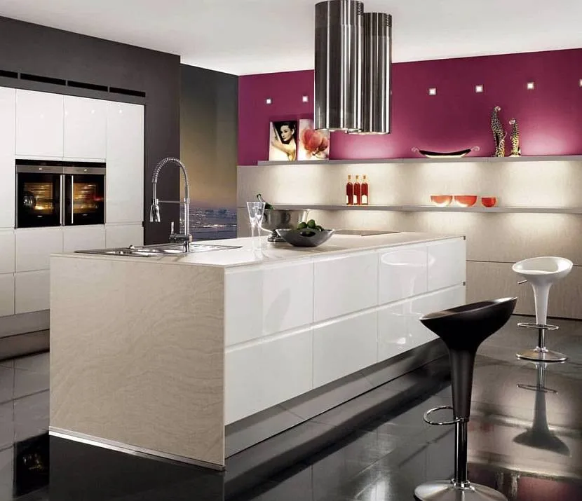 Кухня. Идеальное место для воссоздания оригинального дизайна. Стильная обстановка достигается использованием износостойких высокотехнологичных материалов; предпочтение отдается пластику, алюминию, стеклу, нержавеющей стали. Эталон стиля — комната со специальной модульной мебелью и со всей требуемой техникой; удачный ход — использование акцентной светодиодной подсветки.