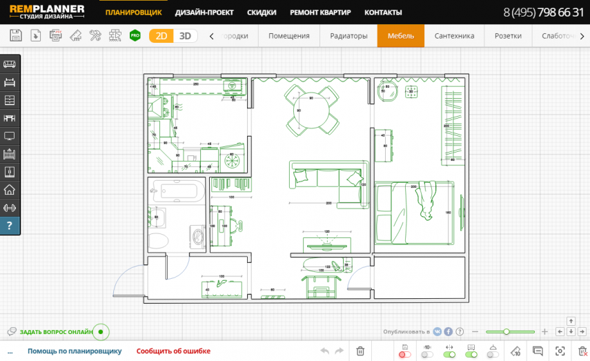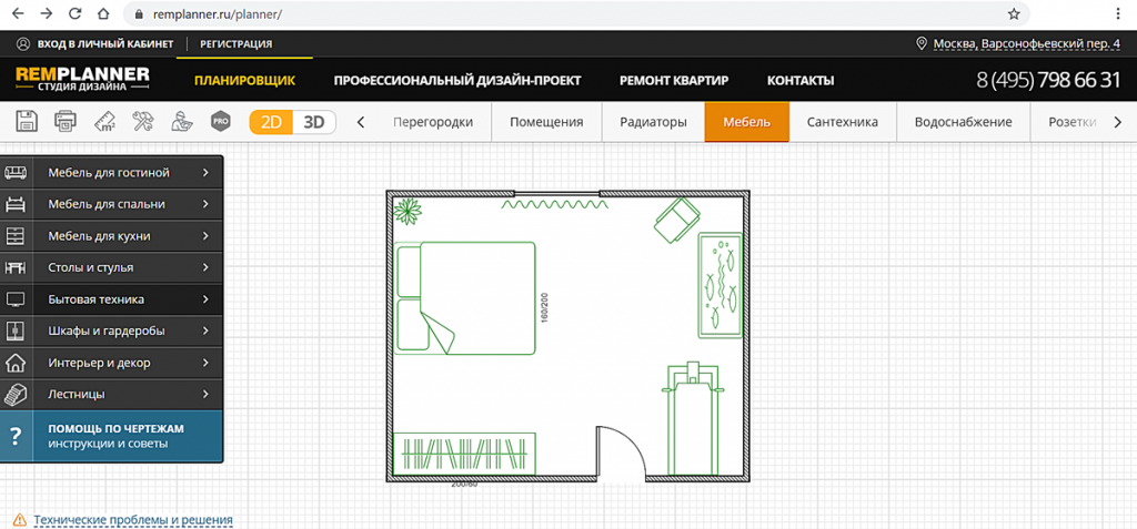 Приложение было создано отечественными разработчиками, есть даже бесплатная пробная версия, в которой функционал несколько урезан. Объекты можно перемещать, для обзора проект можно повернуть, в библиотеке можно найти варианты планировок и предметов. Есть возможность нанесения размеров на помещение.