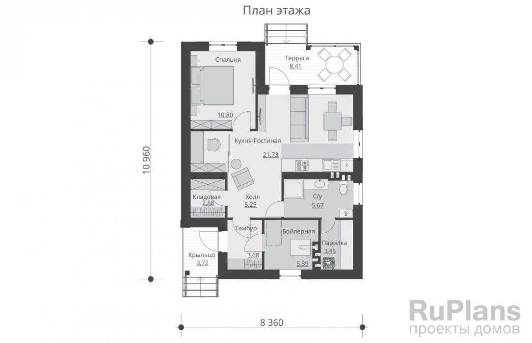 - Проектируя небольшие современные дома, архитекторы сводят до минимума использование внутренних перегородок. Таким образом, различные по своей функциональности помещения объединяются в единое пространство. Например, гостиная, столовая, кухня группируются в дневную зону и разделяются чисто визуально – с помощью дизайнерских приемов. Проект маленького дома позволяет рационально использовать каждый квадратный метр полезной площади. При этом дополнительные комнаты остаются изолированными.