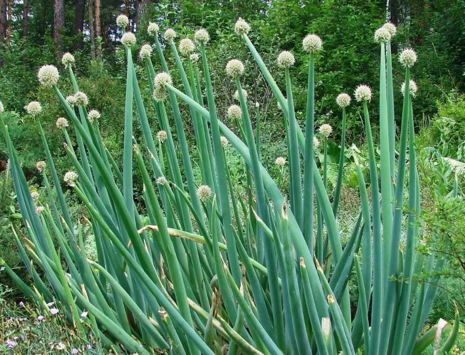 Тоже относится к семейству Луковые, но отличается наличием дудчатых листьев и стеблей. Выращивают его в теплице, открытом грунте, не меняя грядку в течение 4-6 лет. Дудчатый лук имеет высокую питательную ценность, но более нежный вкус, чем другие представители семейства.