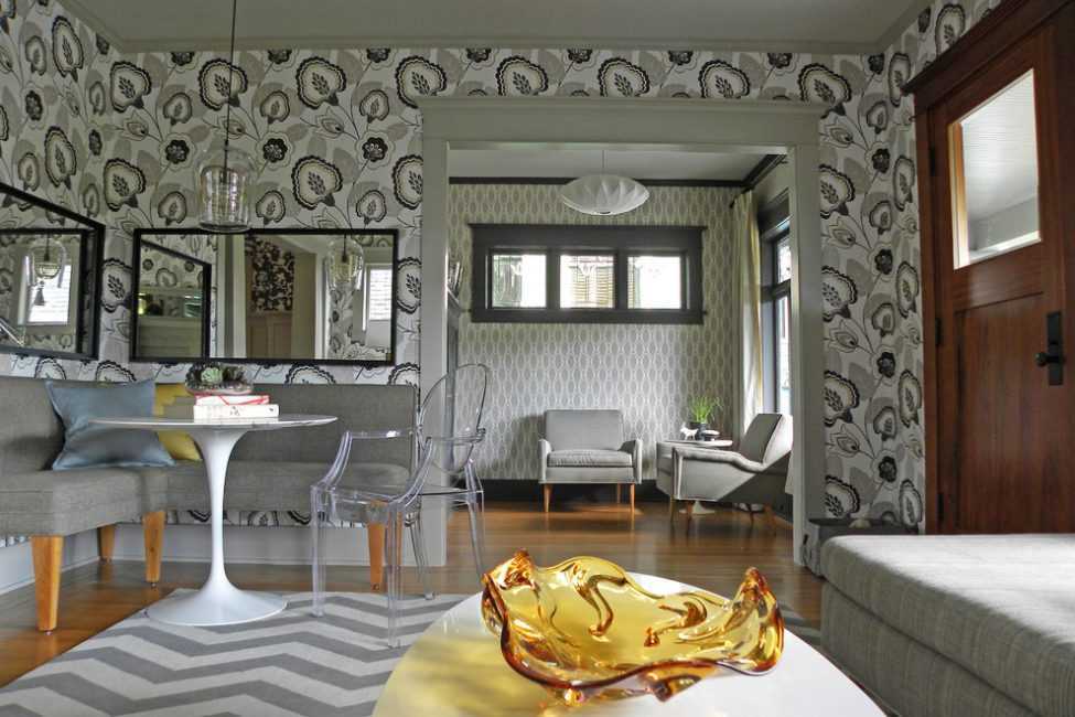 Покрытие стен одним оттенком серого используется в обстановке миниатюрных квартир, помещениях с низким уровнем освещённости. Однотонное полотно комбинируют с обилием декоративных элементов на стенах: картинами, массивными настенными часами, зеркалами, инсталляциями.