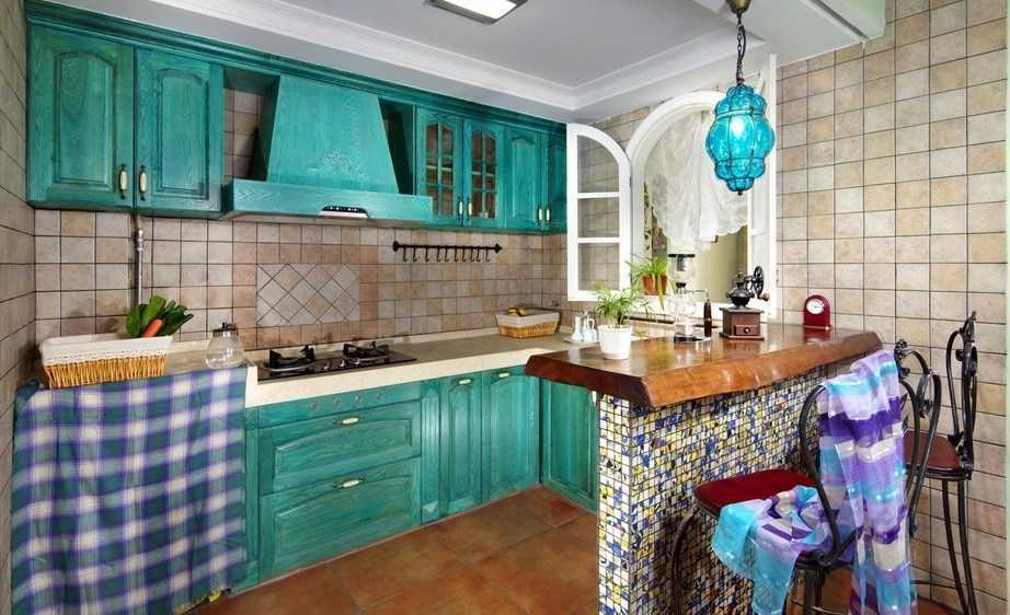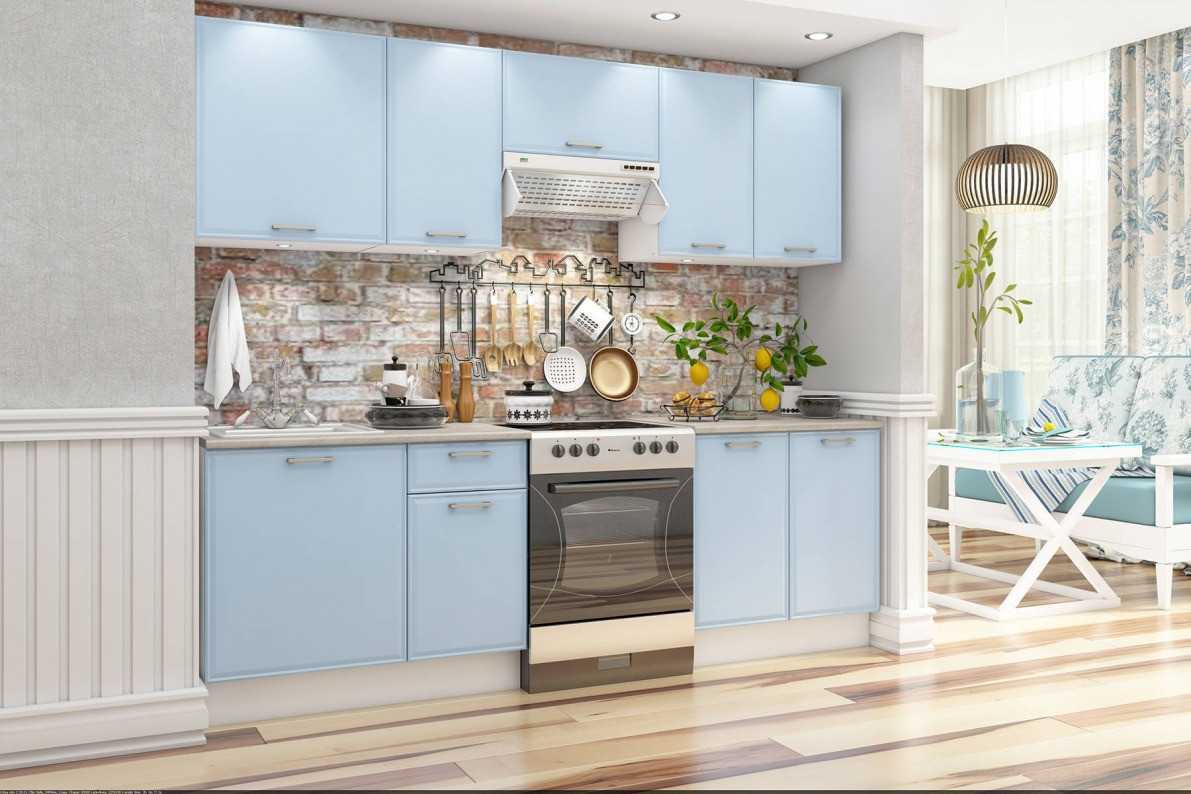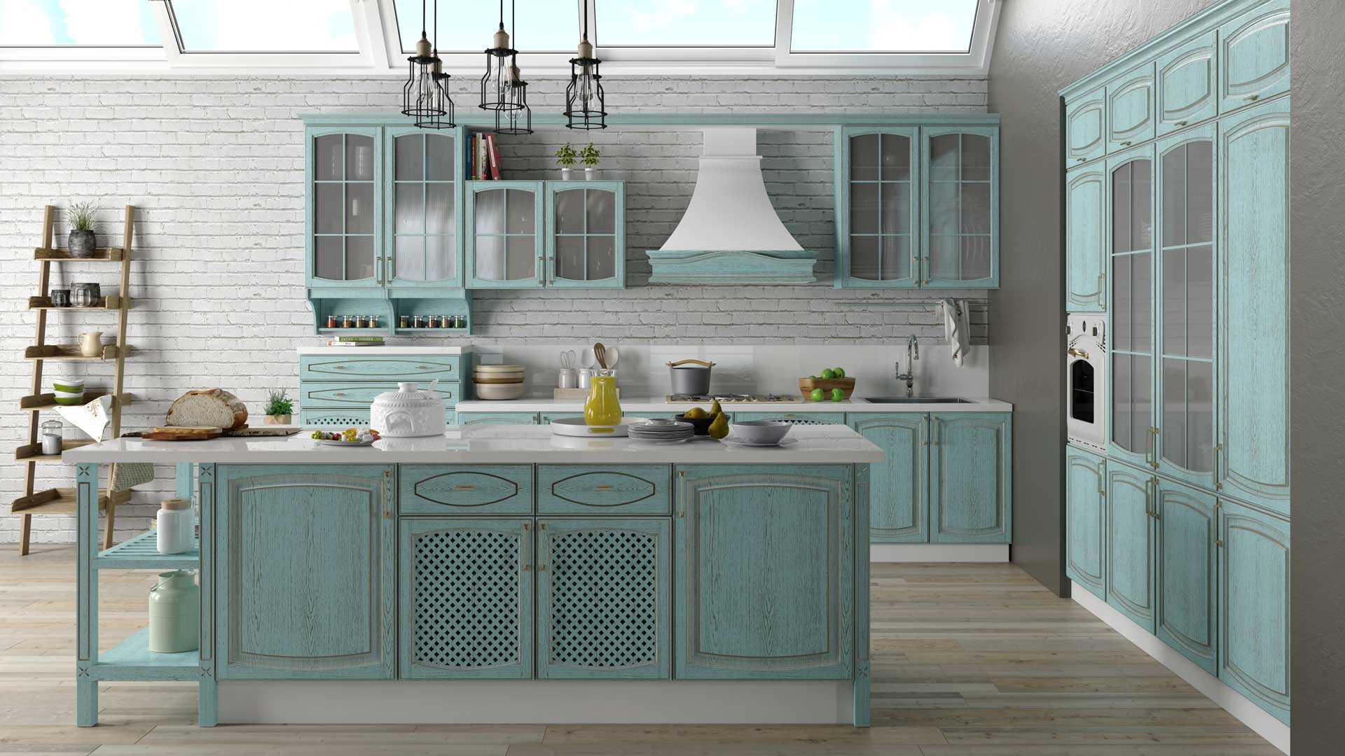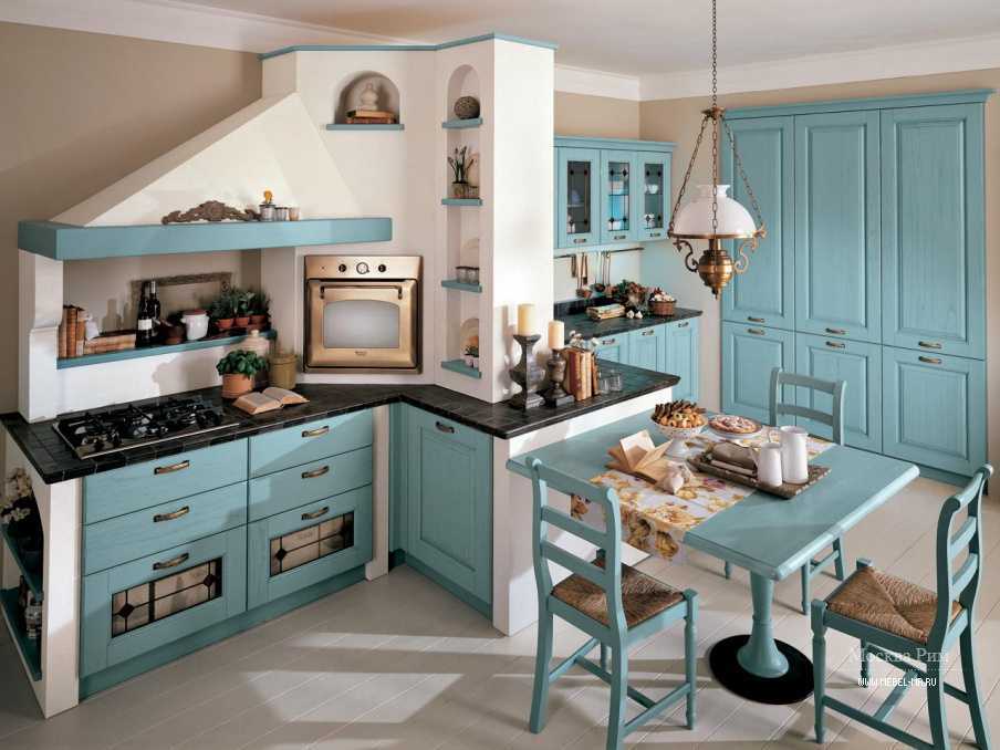 Презентабельно смотрятся гарнитуры в голубой палитре, стилизованные под старинную меблировку. На их поверхности могут присутствовать царапины и потертости. Такая мебель идеально впишется в кухонный интерьер, выдержанный в прованской стилистике.