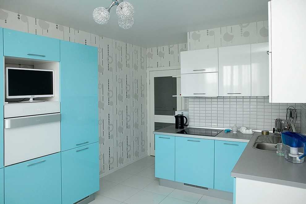 Вместо голубого гарнитура можно выбрать небесные обои. А мебель в этом случае подобрать с белыми или желтыми фасадами. Предпочтение рекомендуется отдавать стеклообоям или покрытиям на флизелиновой основе, их проще содержать в чистоте.