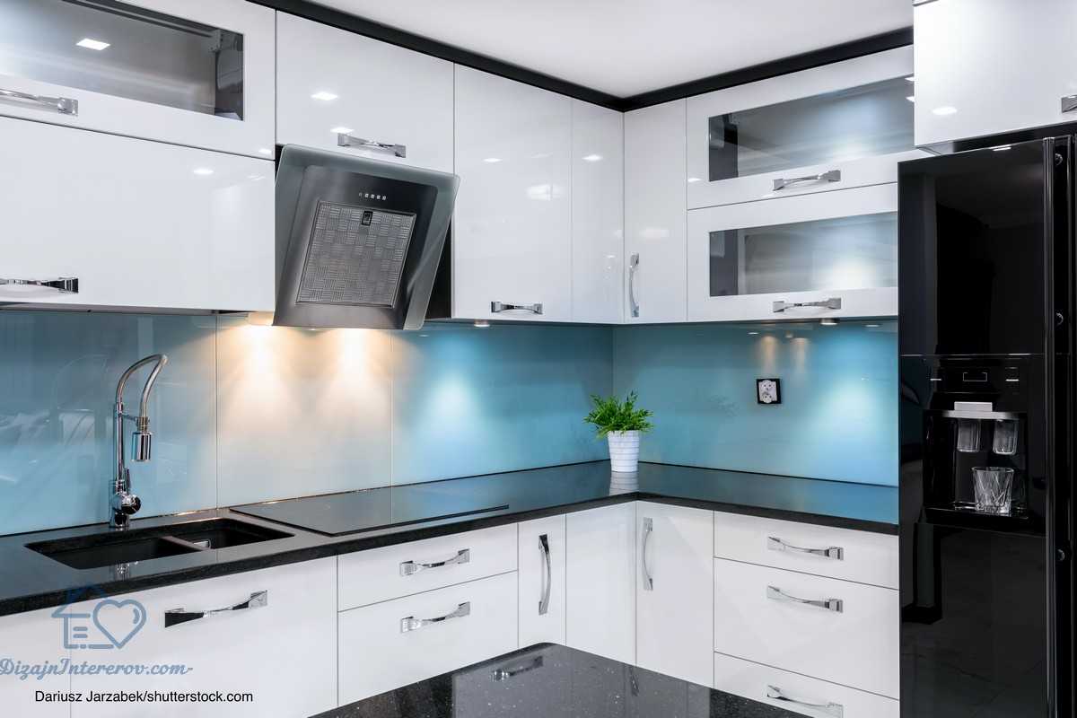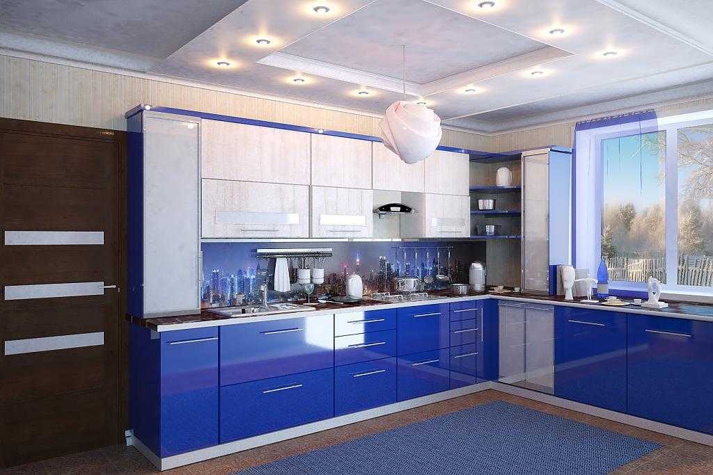 Наибольшей популярностью пользуется вариант оформления, в котором белые стены, столешницы и фартук соседствуют с синими фасадами гарнитура. Это очень гармоничное сочетание, благодаря которому кухня выглядит дорого и стильно.