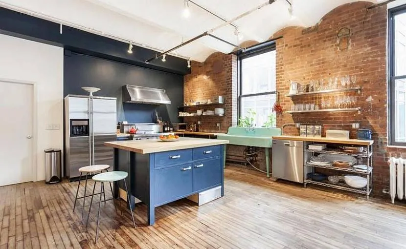 - Бежевым цветом. Теплый оттенок наполняет помещение теплом, в некоторых вариантах он нейтрализует действие холодного синего цвета. Интерьер такой кухни выглядит сдержанно, но в то же время празднично. Синяя мебель, кирпичная кладка, темно серые стены, — идеальное оформление лофт кухни.