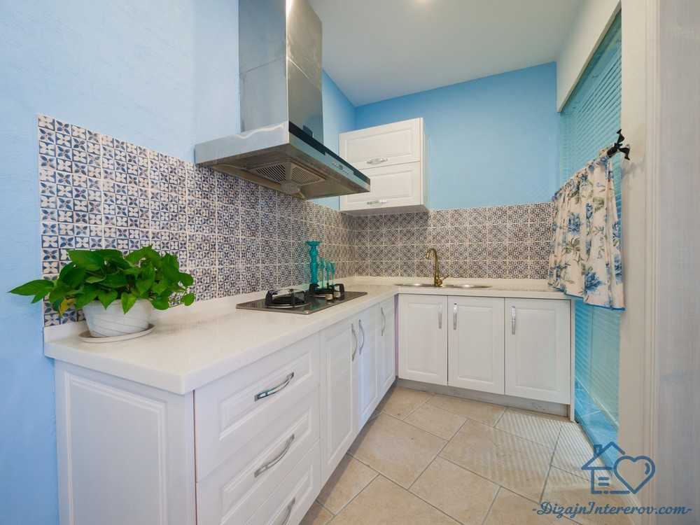 Кухонный гарнитур может быть чисто голубым или предусматривать наличие белых, бежевых, желтых фасадов. Эти комбинации самые удачные. В большинстве случаев предпочтение отдается пластиковой мебели.