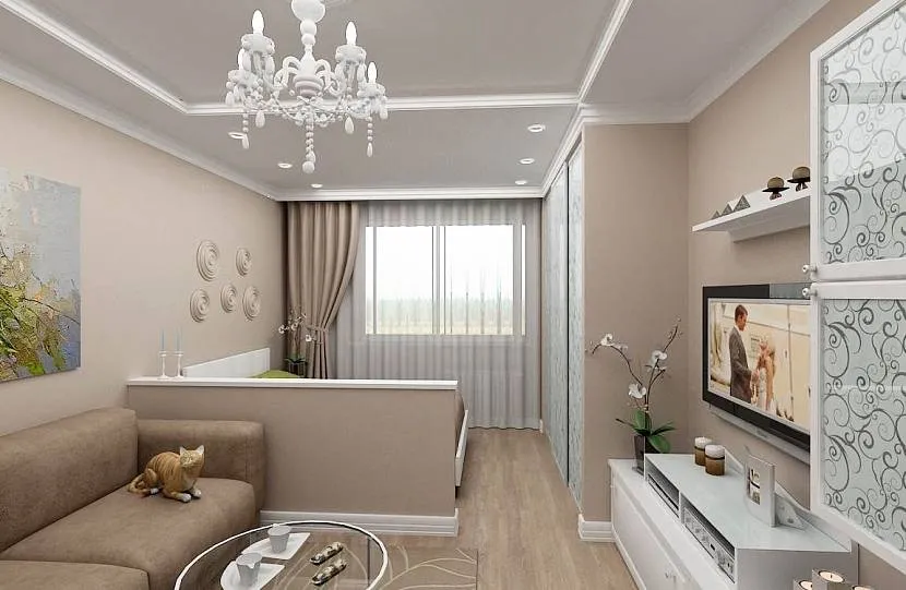 Спрятать кровать можно за ширмой, перегородкой из гипсокартона, занавесками, стеллажом, а остальное пространство отвести под гостиную с вместительным уютным диваном, ТВ-тумбой и журнальным столиком. Телевизор может быть закреплен на поверхности перегородки, отделяющей спальню от гостиной.