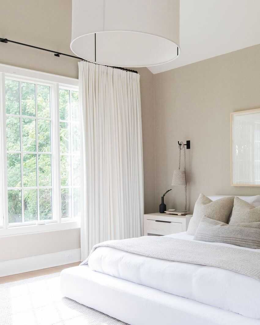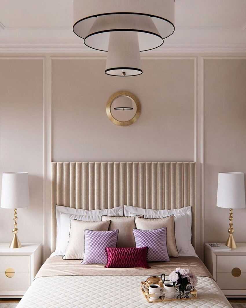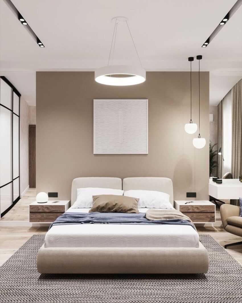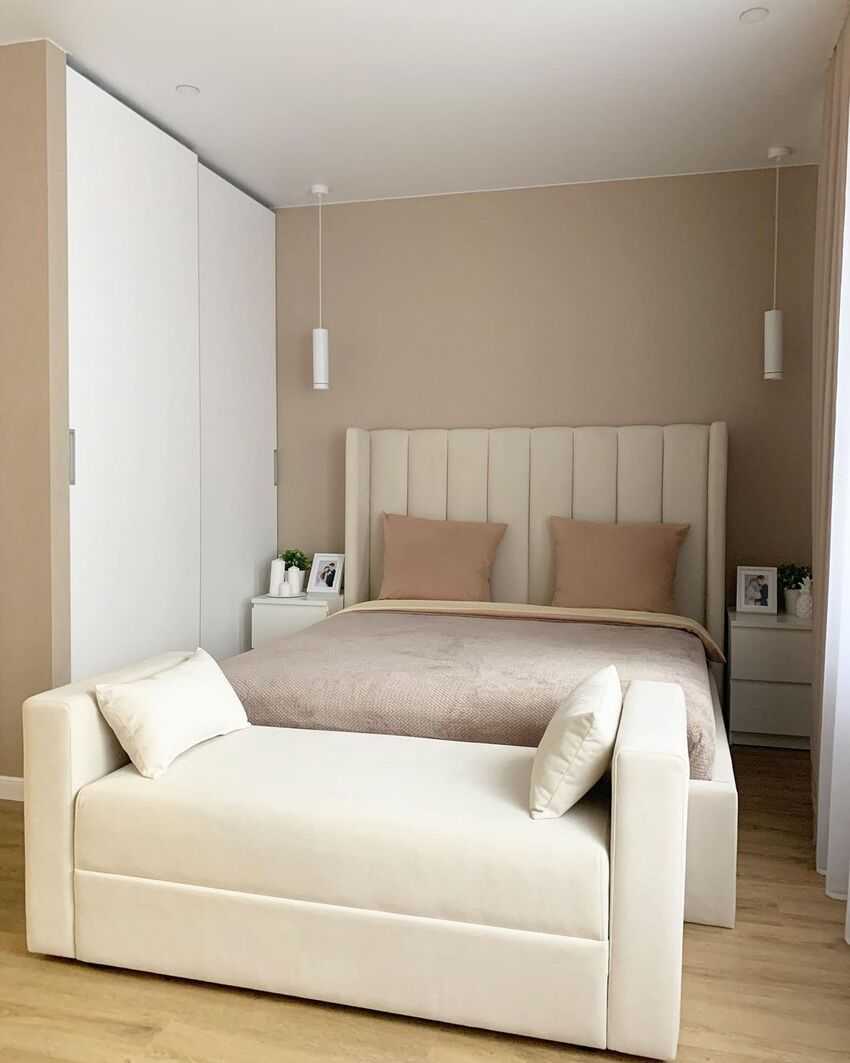 Принято считать, что бежевый в комнате отдыха — залог тихой и спокойной энергетики, он располагает к релаксу, создавая атмосферу уюта. Однако дизайнеры отмечают, что преобладающий бежевый цвет в интерьере спальни сделает ее чересчур скучной и монотонной