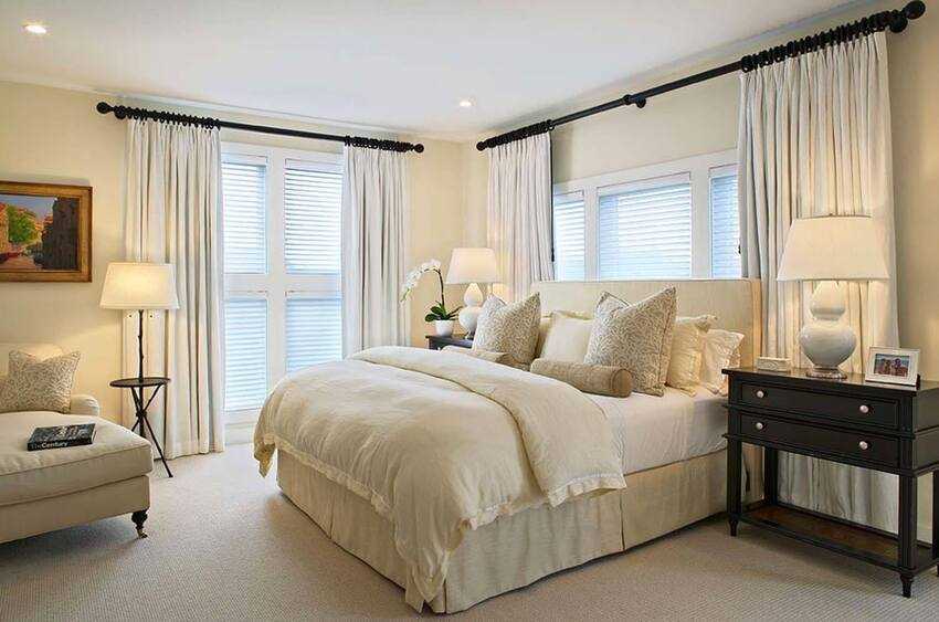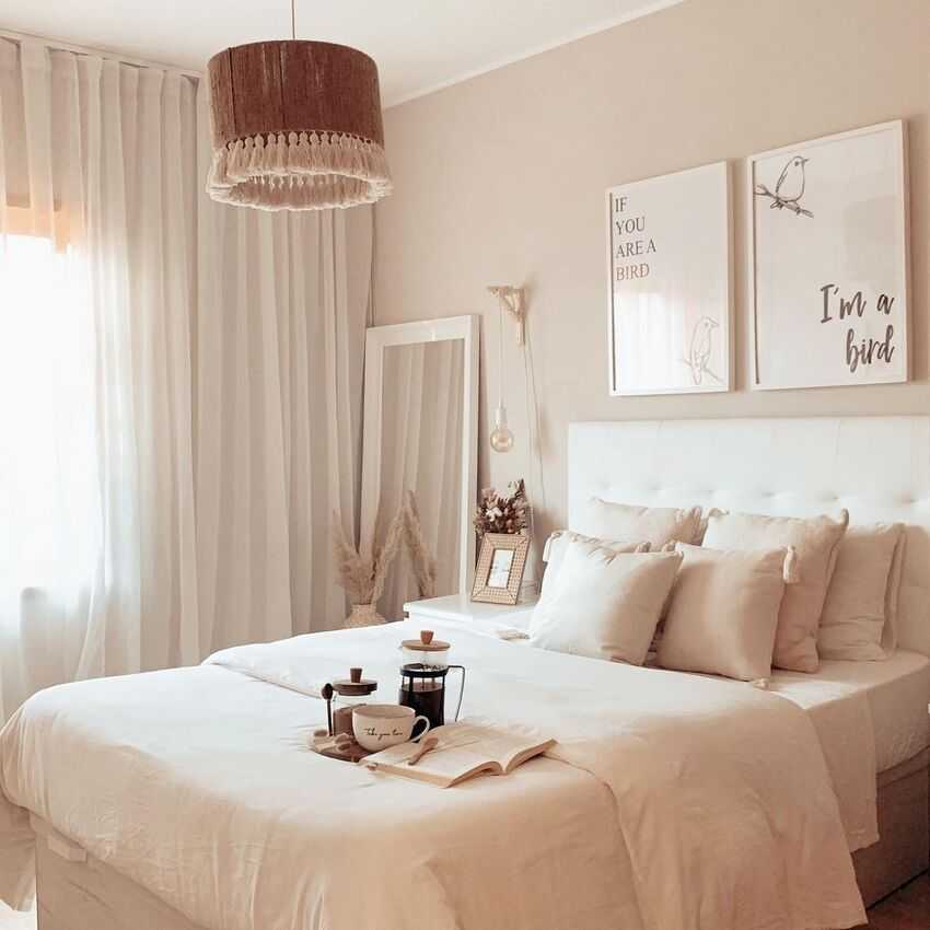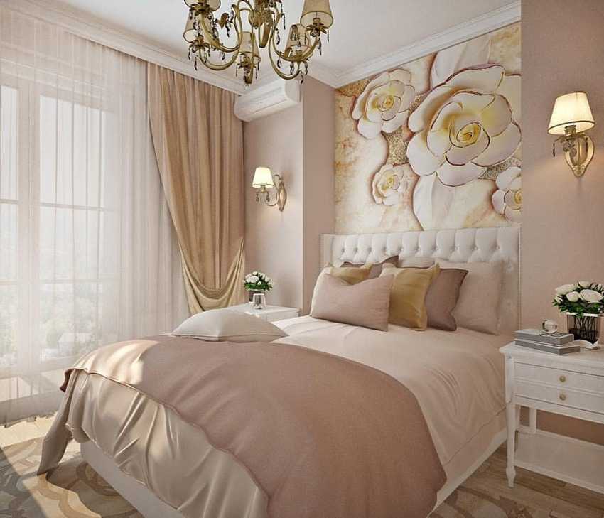 Рассмотрим несколько наиболее популярных композиций песочного цвета в интерьере опочивальни: