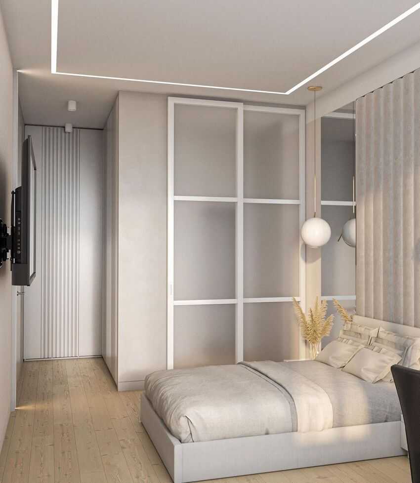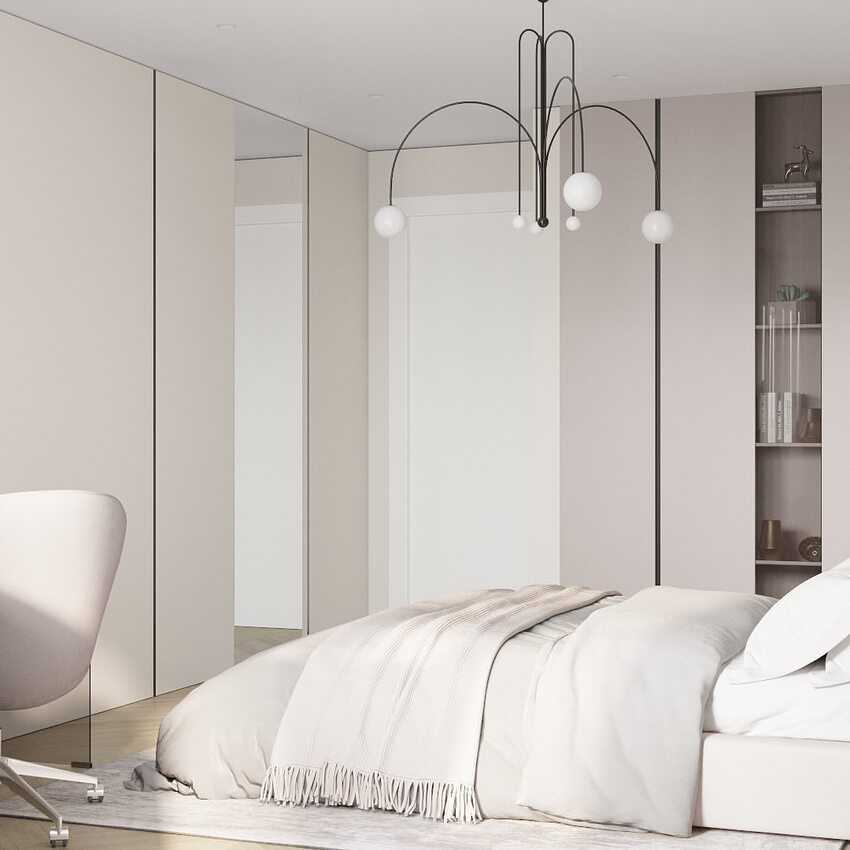 В стиле минимализм, все что не имеет практического применения, желательно исключить из состава интерьера. В светлой спальне приветствуются детали, которые визуально расширяют пространство: зеркала на стенах, глянец на потолке, блестящие поверхности.