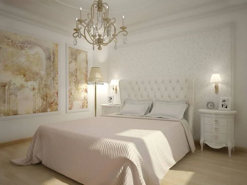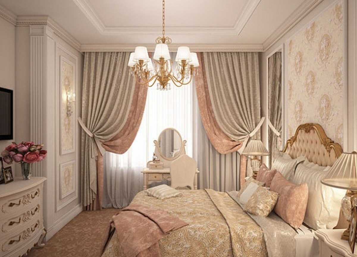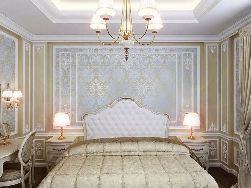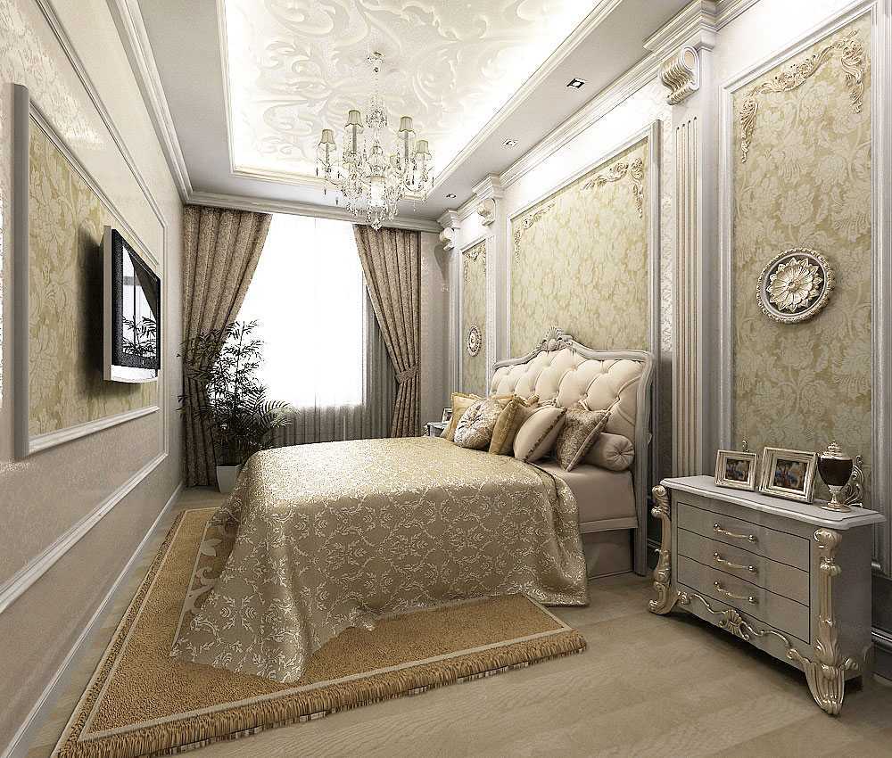В отличие от прованса, классический дизайн интерьера маленькой спальни не должен изобиловать узорами. В такой комнате достаточно будет еле заметных завитков и мелких рисунков.