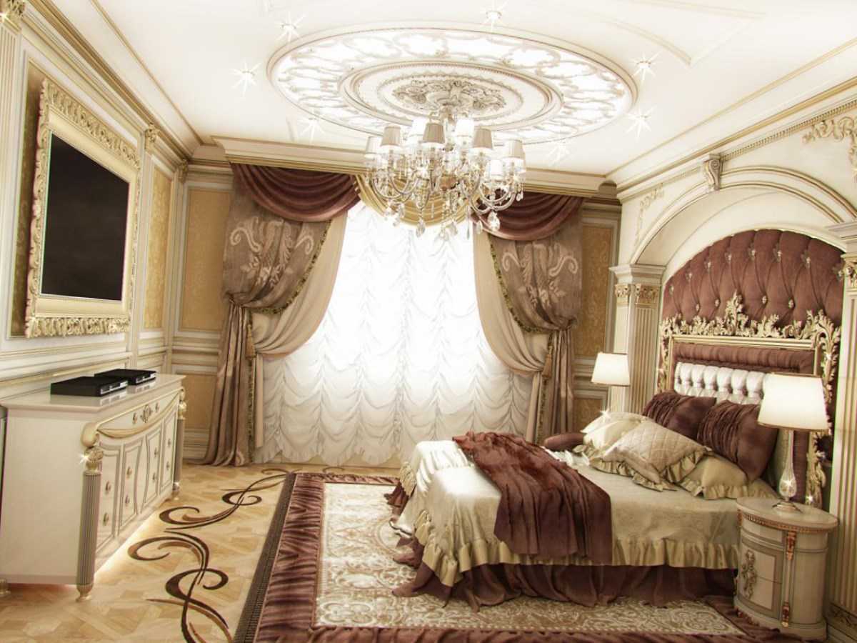 Классическое оформление спален лучше смотрится в просторных помещениях с большими окнами и высокими потолками.