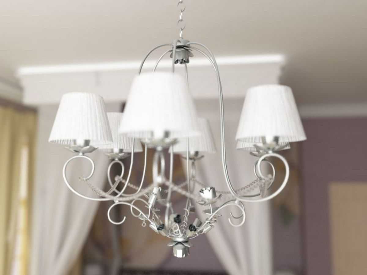 - Люстра. Центральный крупный элемент с изящными плафонами или хрустальными подвесками. Прибор фиксируют на потолке к розетке с лепниной. По периметру устанавливают точечные софиты.