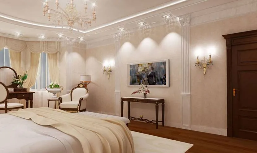 Несколько уровней в освещении обеспечивают яркий и торжественный свет, который характеризует классический стиль. Но также не стоит забывать, что спальня – это место для отдыха и уединения, поэтому в повседневности обычно задействованы два уровня.