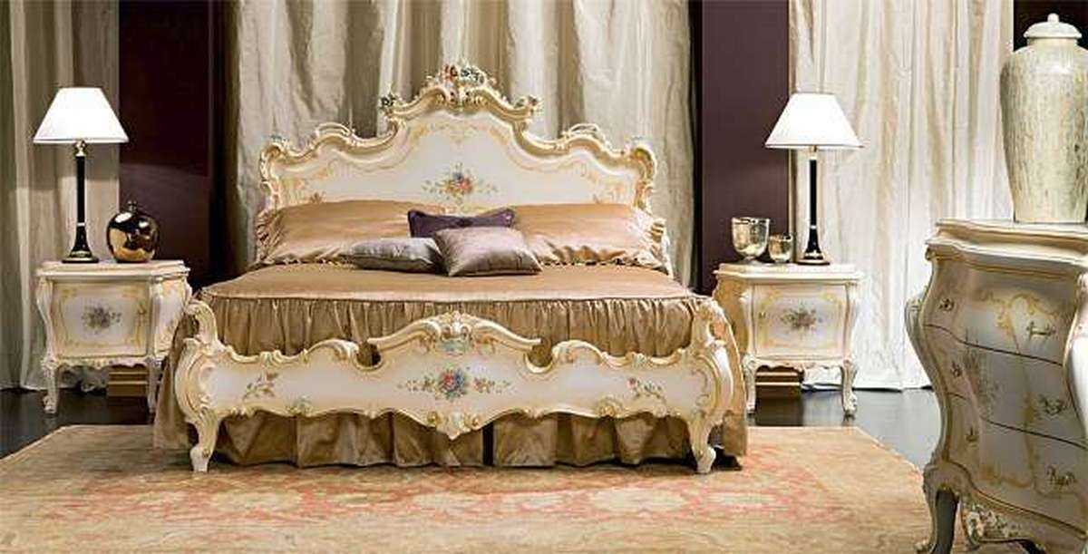 Кровать украшается большим фигурным изголовьем, оформленным мягкой вставкой и резными деталями. Она представляет собой основной предмет обстановки, играя главную роль. В некоторых случаях ложе может быть декорировано кованными элементами. Также допустима позолота или украшения под бронзу.