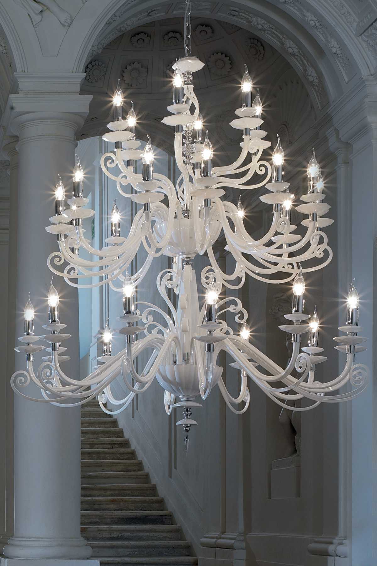 - Верхний уровень обеспечивает центральная люстра, которая должна быть крупной, но при этом изящной. Допускаются модели с хрустальными подвесками и однотонными плафонами. Такая люстра крепится к лепной розетке.