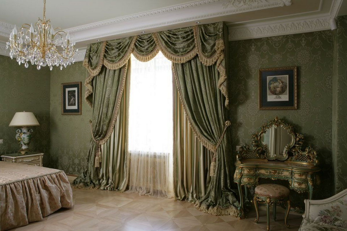 Если дизайн штор продумать до мелочей, то они могут стать визитной карточкой помещения. Окно в классическом стиле оформляется двумя полотнами портьеров и украшается ламбрекеном. Занавесы с обеих сторон прихватываются держателями или тесьмой. Также в комплекте должна быть прозрачная гардина из тонкой ткани.