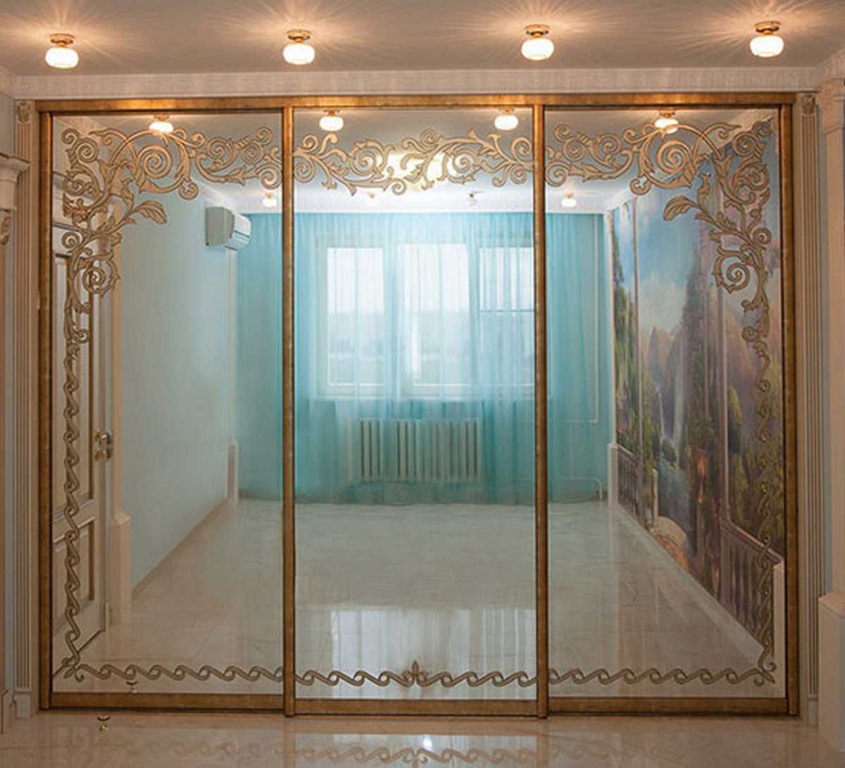 Не забывайте, что в условиях классического стиля, необходимо дополнить шкаф соответствующими штрихами. Если поверхность шкафа зеркальная, можно выбрать вариант вензелей нанесённых пескоструйным напылением.
