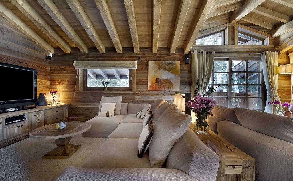 Огромное внимание уделяется мебели. Она должна быть массивной, больших размеров – гостиная в стиле шале не может иметь низенький, едва заметный диванчик