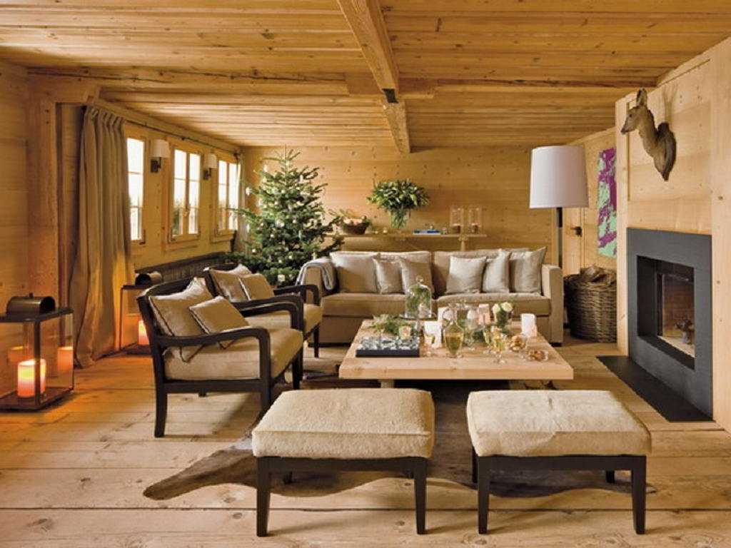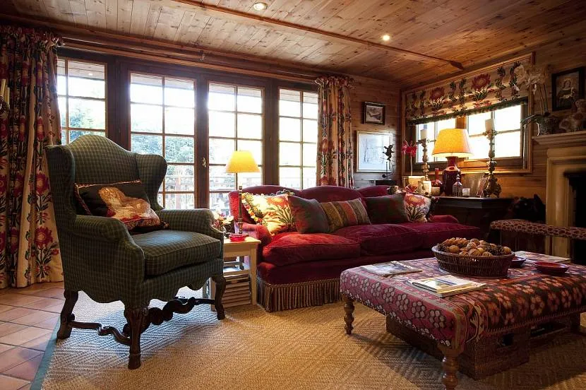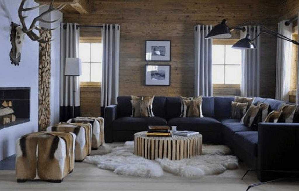 Благодаря добавлению красочного войлока, холста, хлопка, кожи и меха, например, пуфы, чехлы на стулья, подушки, вы можете достичь климата шале практически в любом интерьере гостиной. Красочные шторы подчеркнут атмосферу деревянного дома. Они чаще всего вешаются на железные или деревянные карнизы, лучше всего скрепленные скобами, привязанными липучкой или морщинистой лентой.