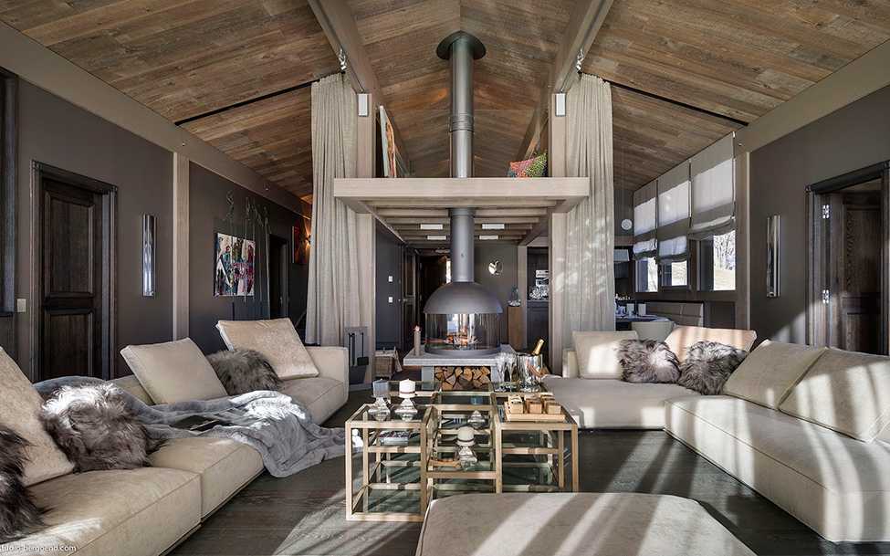 Под гостиную в стиле шале отводится самая просторная комната с высокими потолками. Благодаря большим окнам комната буквально заливается солнечным светом.