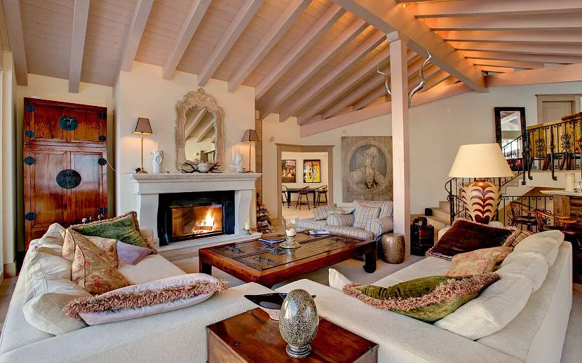 Центральное место гостиной отводится добротному, выложенному из цельного камня камину. Согревающий и уютный, он собирает около себя всех членов семьи и гостей.
