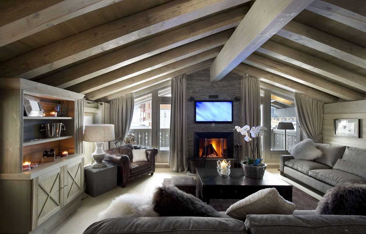 В качестве альтернативы можно рассматривать и пластиковые имитации, которые обойдутся дешевле, но лучше так не экономить, ведь атмосфера шале – это не только дизайн, но и запах. Не забывайте также о том, что швейцарцы усиливали потолки альпийских домиков поперечными балками и целыми бревнами для большей прочности – даже если под отделкой скрываются надежные современные материалы, вы все равно должны соблюсти ключевые черты дизайна.