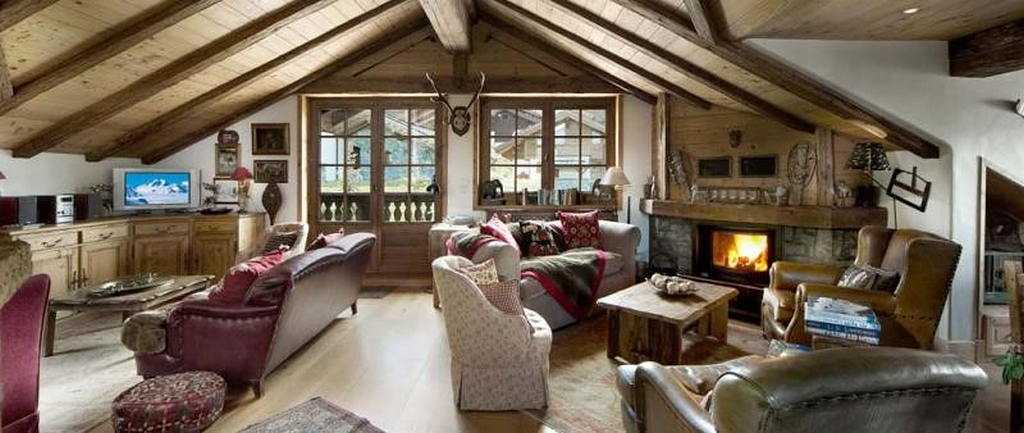 В то же время прямые линии, угловатость, причудливые формы кресел и столиков в стиле второй половины 20 века гармонично ложатся на фон в стиле шале.