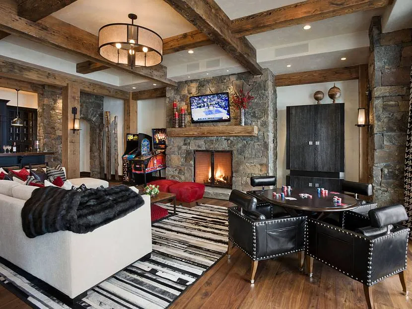 В гостиной придерживаются подчеркнутой брутальности стиля. Этот эффект достигается за счет использования плохо обработанных деревянных фактур, приемов состаривания камня и дерева, обнаженной каменной кладки и продуманных аксессуаров.
