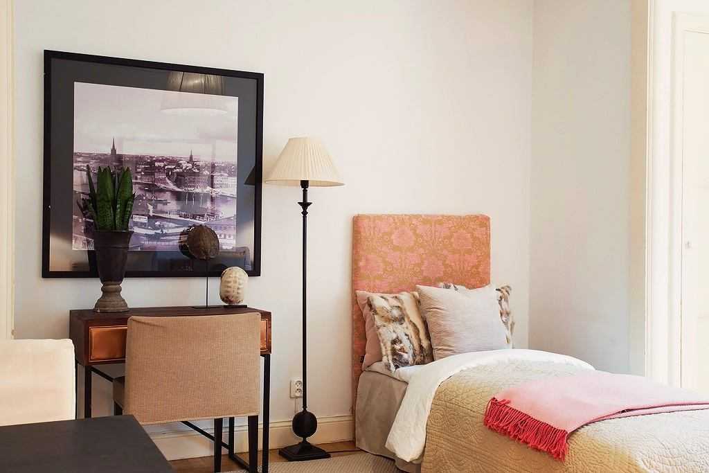Цветовое решение сдержанное, расслабляющее, с неожиданными моментами. Видно, что молодой человек стремится к независимости, любит быть модным и креативным. Скорее всего он выбрал свой путь, а не стал наследником бизнеса родителей. Ощущается творческий подход к оформлению пространства. В качестве основы выбран светлый цвет. Для мини-пространства это просто идеальный вариант. Чтобы внести рафинированную элегантность и шик в интерьер, сюда добавили серый и розовый цвета. Да, неожиданно видеть кровать с таким оригинальным изголовьем в квартире молодого человека. Но этот оттенок трендовый, причём у мужской аудитории. Он отличается более спокойной пастельной гаммой, способной гасить агрессию. Чтобы интерьер не смотрелся ванильно, его было решено подчеркнуть чёрными акцентами. В сочетании с медью это создаёт авторитетное, глубокое, внушительное впечатление. Недаром чёрный цвет ассоциируется с элегантностью, силой и уважением. То есть хозяин квартиры хочет добиться признания и положительного отношения со стороны родителей.