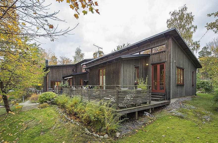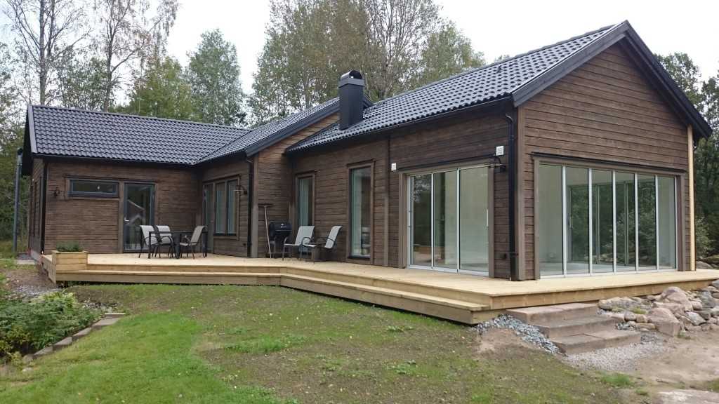 А вот как выглядит дом с постоянной кровлей, крашеным фасадом и террасой. Скромная шведская красота.