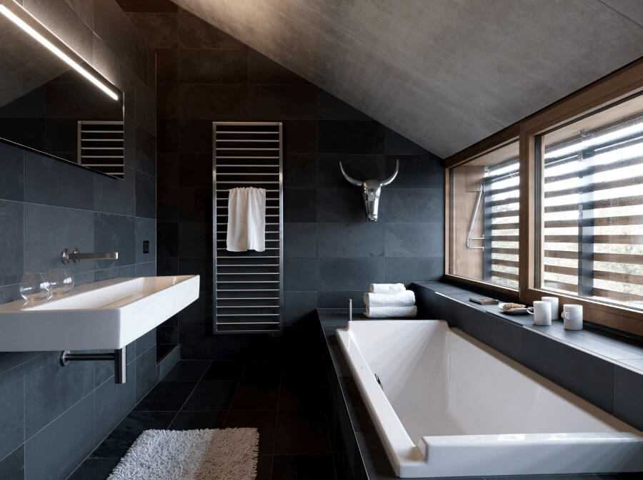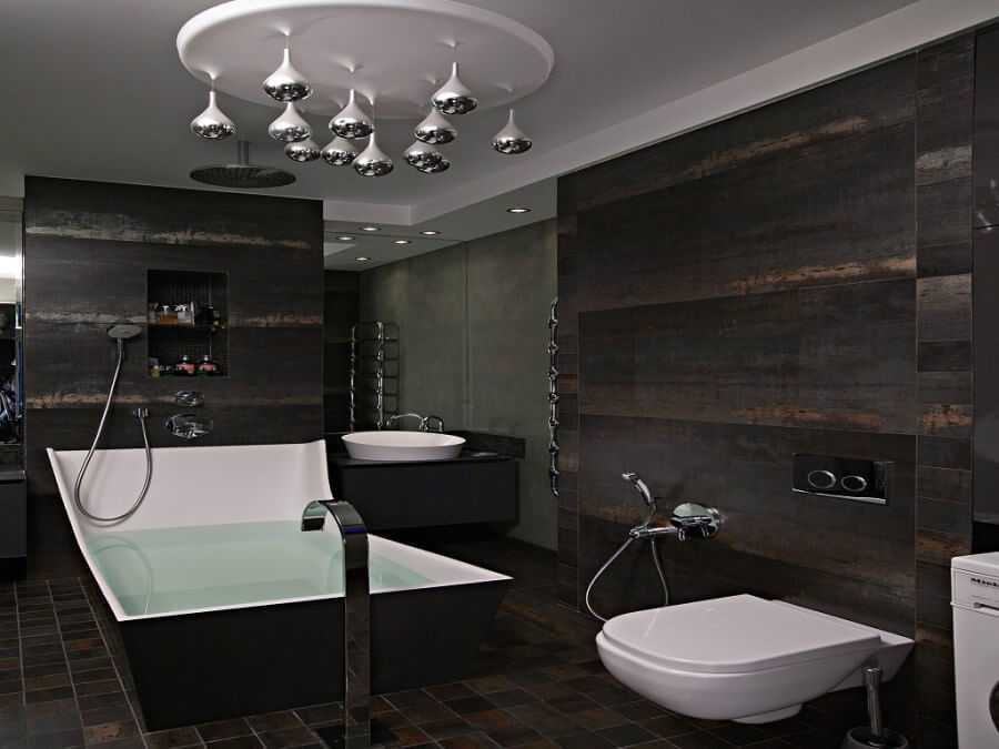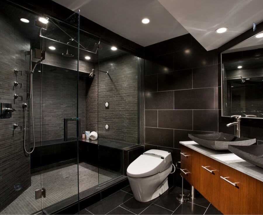 Многие не догадываются, как изящно выглядит ванная комната с преобладанием темных цветов. Черный колер сочетается со всеми оттенками.