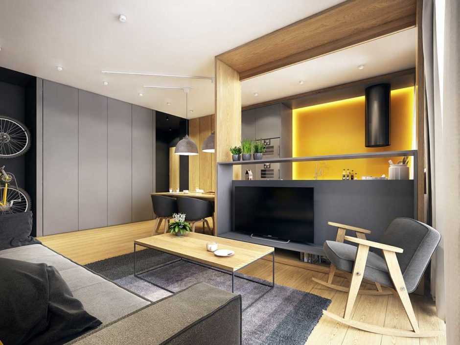 Одним из самых интересных элементов минималистического интерьера кухни-гостиной является зонирование пространства с помощью мобильных легких перегородок. Допускается применение комбинирования цвета и материалов напольных покрытий, а также грамотное проектирование освещения. Актуальными для минимализма представляются: