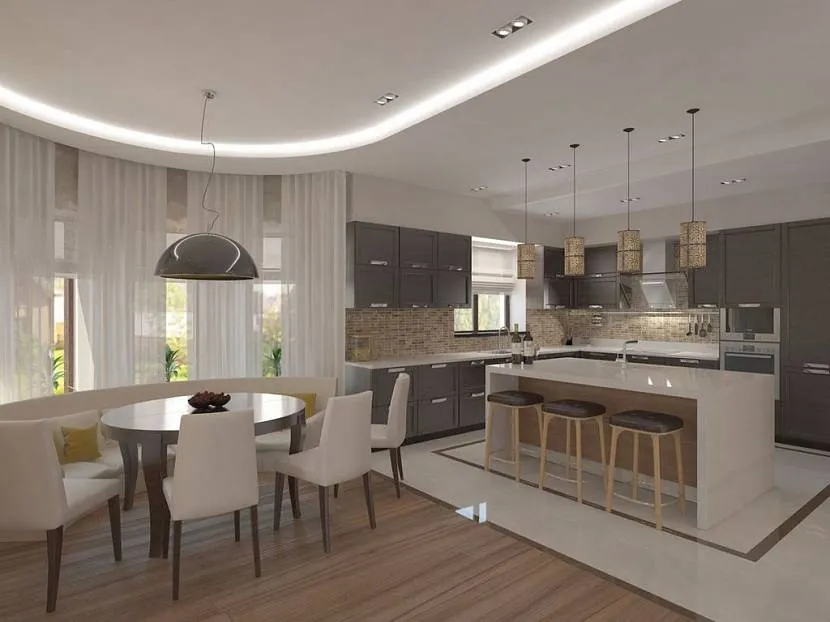 Все зависит от пожеланий будущей хозяйки: ее можно сделать квадратной формы с большим функционалом, который необходим исключительно для приготовления пищи (около 15м2), а можно соединить с барной стойкой и сделать кухню с «островком» по центру. Красиво смотрится прямоугольная планировка, где кухонный гарнитур расположен вдоль всей стены. Этот вариант выглядит дорого и богато, а также дает возможность гармонично встроить всю бытовую технику.