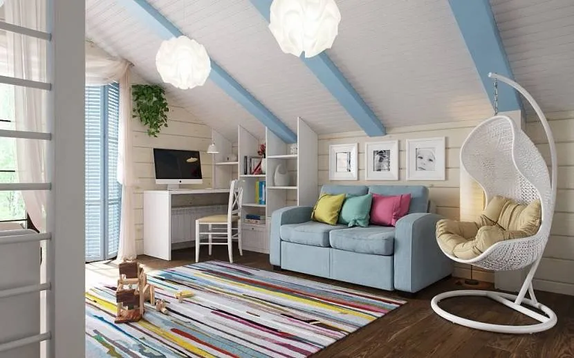 - В детской в правой части этажа места хватит на шкаф, рабочее пространство и кушетку, которая при необходимости трансформируется в полноценную двуспальную кровать.